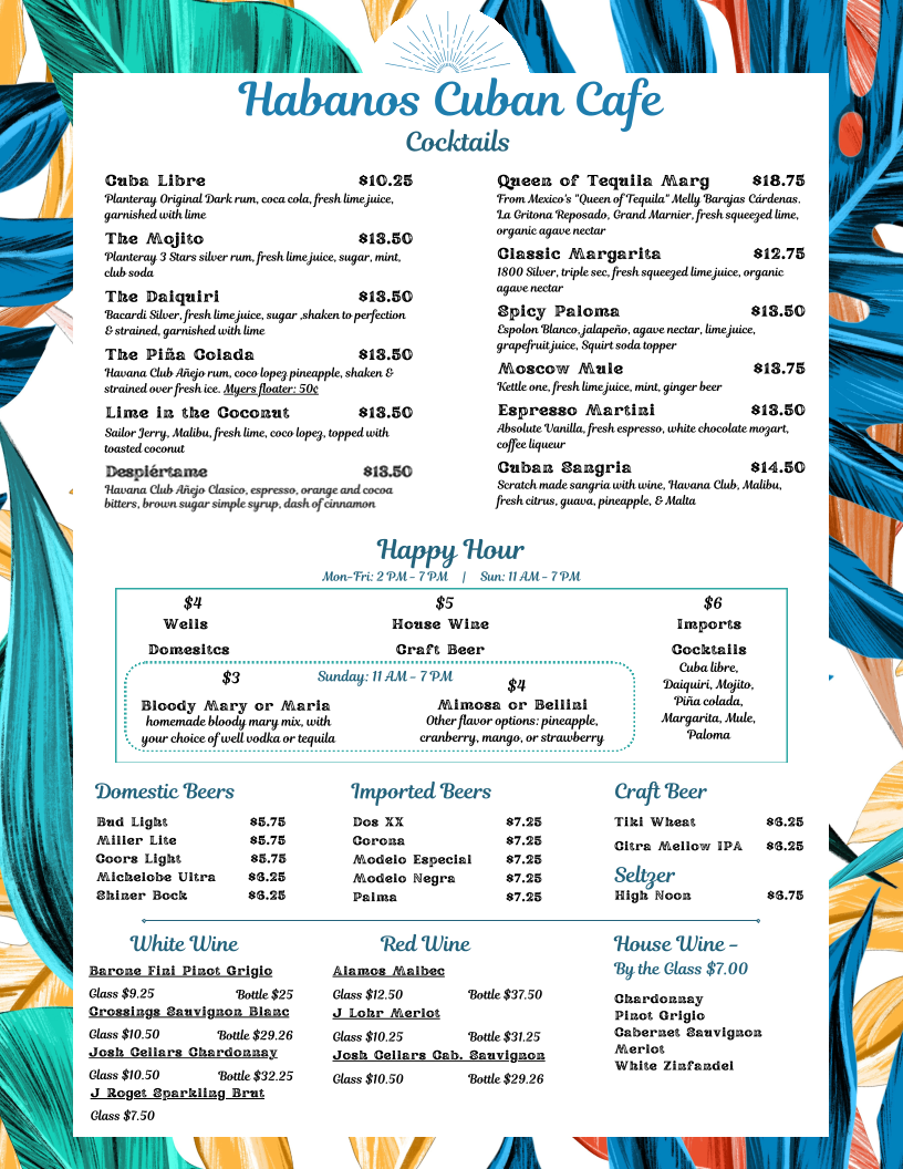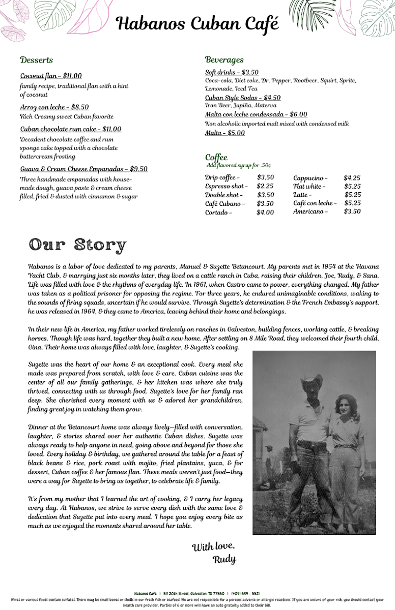 Welcome to Habanos Cuban Cafe, located at 511 20th St, Galveston, TX. This vibrant eatery embodies the warmth and rich flavors of Cuban cuisine, all while providing a welcoming atmosphere enhanced by its beautiful tropical decor.